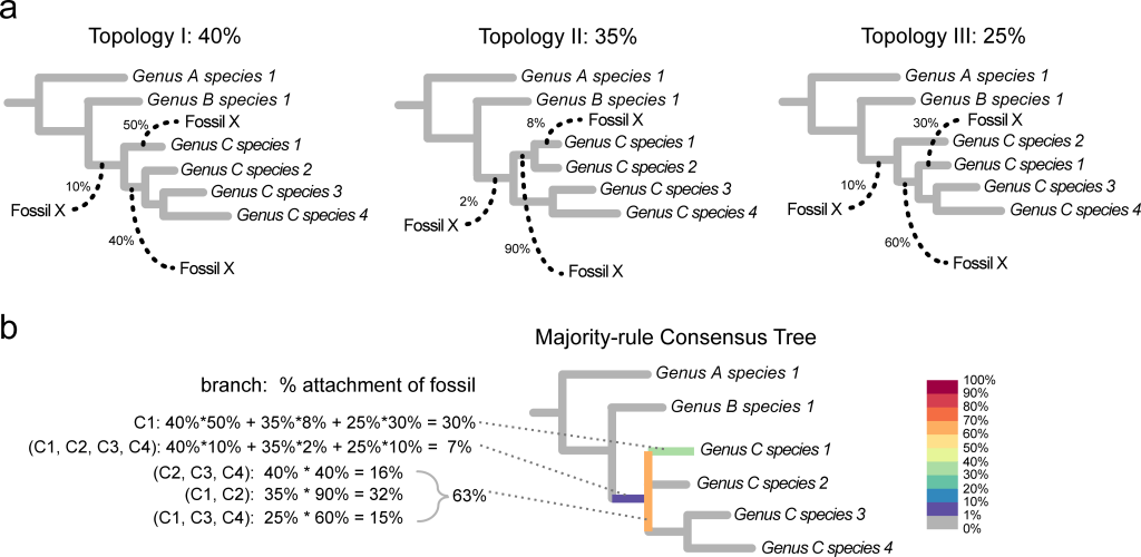 An alternative to consensus networks is the use of RoguePlots, a method elaborated by Seraina Klopfstein and Tamara Spasojevic and implemented as a library in R. These graphs are particuarly advantageous for situations where one of few fossil taxa are placed on a ‘backbone’ topology derived from molecular or other analyses, a practice which is quite common for fragmentary plant fossils. However, they work well for any kind of analysis.