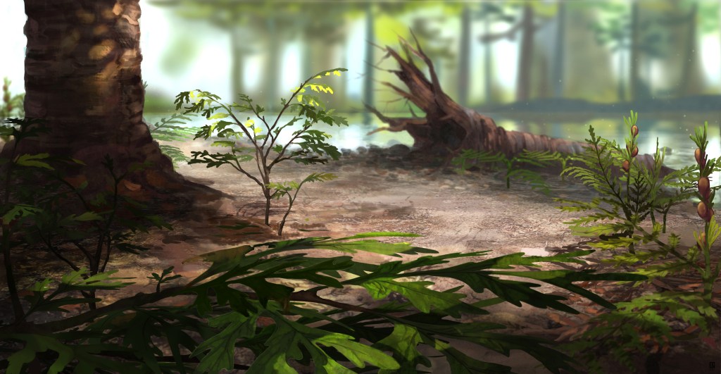 This is an example of how plant paleoart can still be scientifically sound and artistically pleasing even when including many speculative ideas. The riverbank environment of the piece was inspired by the depositional environment of the layer, where most fossils show little evidence of transport and are deposited in fluvial deposits. The lightning of the scene reflects the more open canopy that coniferous forests with araucarian trees tend to have. On the other hand, the small, fern-like habit of the Ruflorinia/Ktalenia plant and most of the details of the Mesodescolea plant have no direct evidence supporting them. However, Ida was inspired for this reconstruction by extant examples of understorey plants (from the Austrobaileyales for Mesodescolea). The understorey habit was inferred from the presence of cuticular striae on the cuticle and large stomatal vestibula of both Mesodescolea and Ruflorinia, traits which have been often associated with plants growing in shaded, wet conditions.