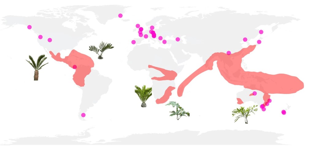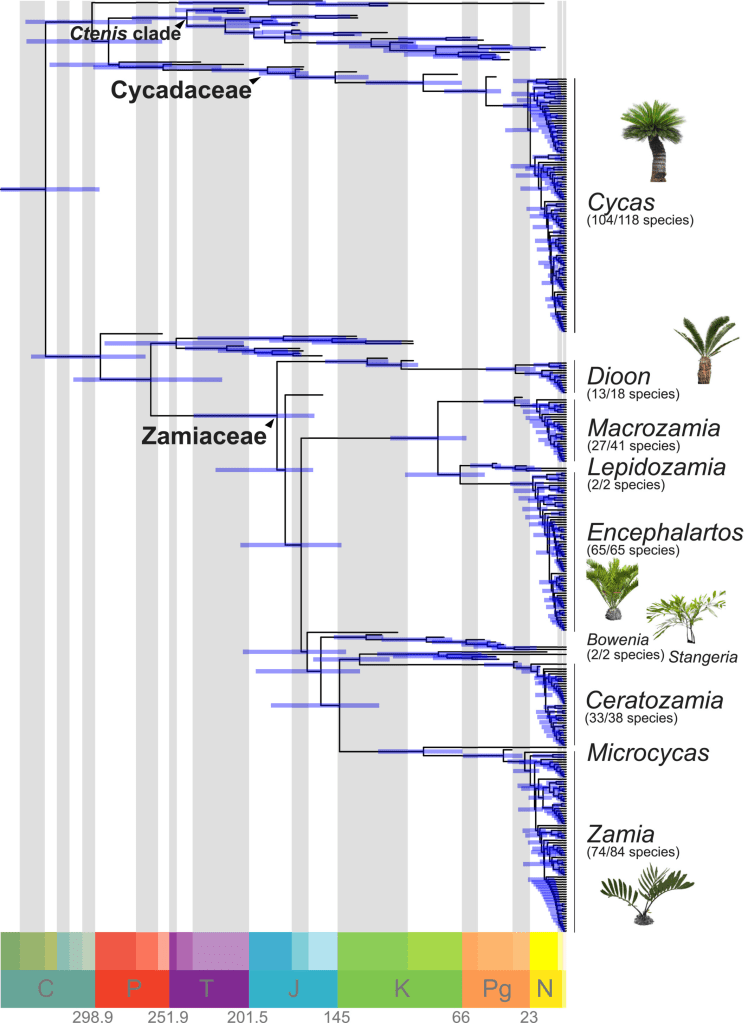 Recently, the results of a long-lasting project on the phylogeny and evolution of the cycads have been published on the journal New Phytologist. This project started with part of my Doctoral thesis at the University of Zurich, and continued and concluded while I was working at the University of Vienna thanks to funding from the Austrian Science Fund with co-pi Leyla Seyfullah. The work was greatly expanded thanks to a collaboration with colleagues from the University of Montpellier.